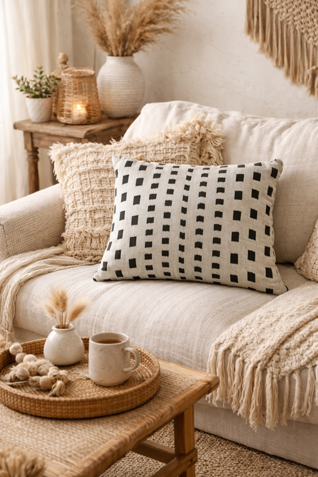 Dankzij het royale formaat is het kussen niet alleen een echte blikvanger op de bank of fauteuil, maar ook heerlijk comfortabel. Ideaal om contrast en diepte toe te voegen zonder de strakke sfeer te doorbreken.