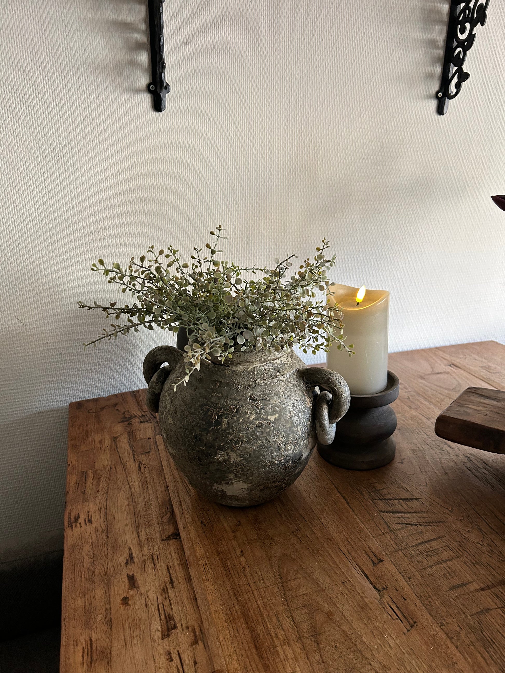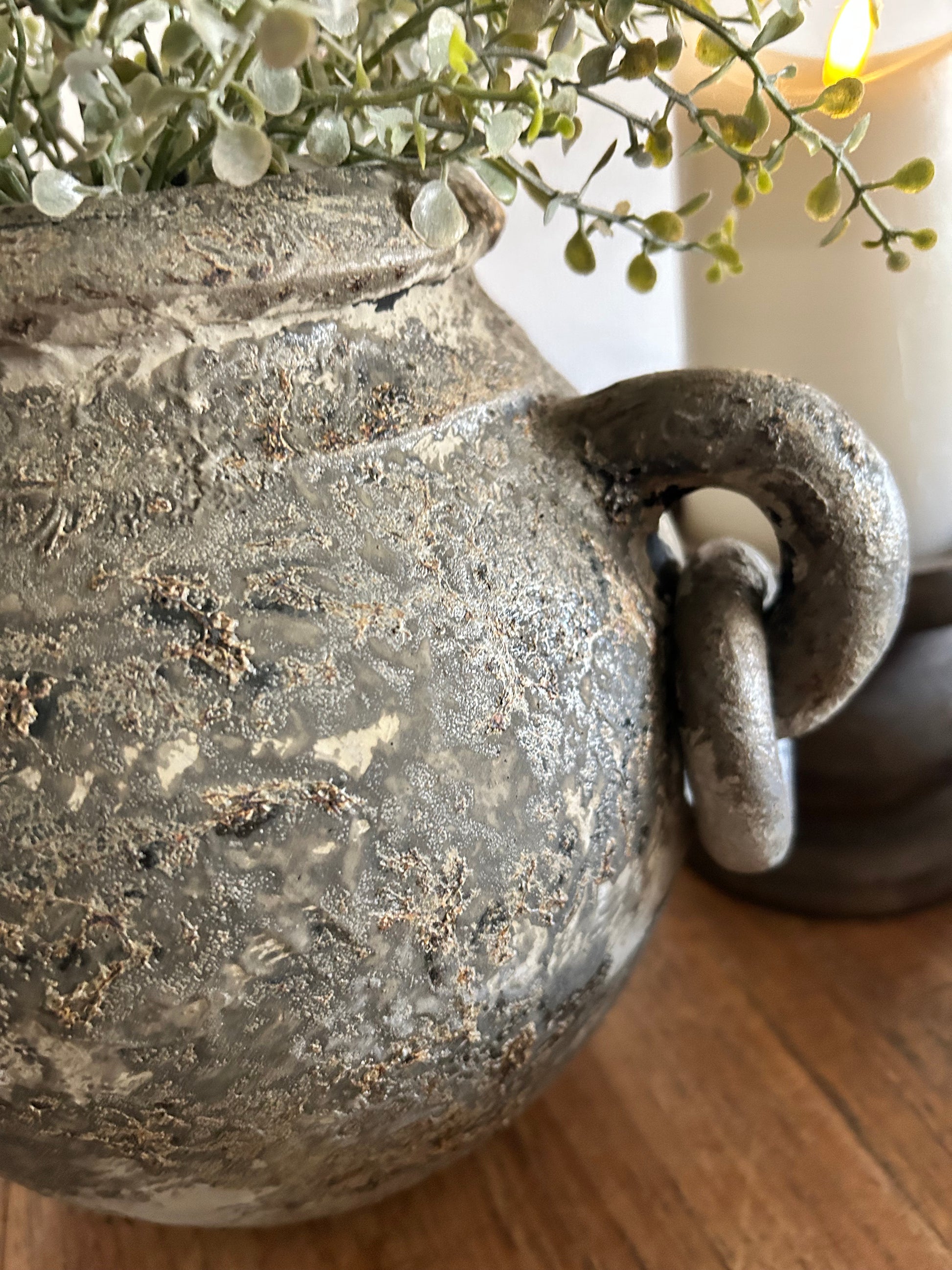 De sierlijke oren met ringen geven de vaas een stoer en ambachtelijk karakter, terwijl de zachte groen/grijze tint juist rust en warmte uitstraalt. Hierdoor past deze vaas perfect binnen een landelijk, sober of industrieel interieur.