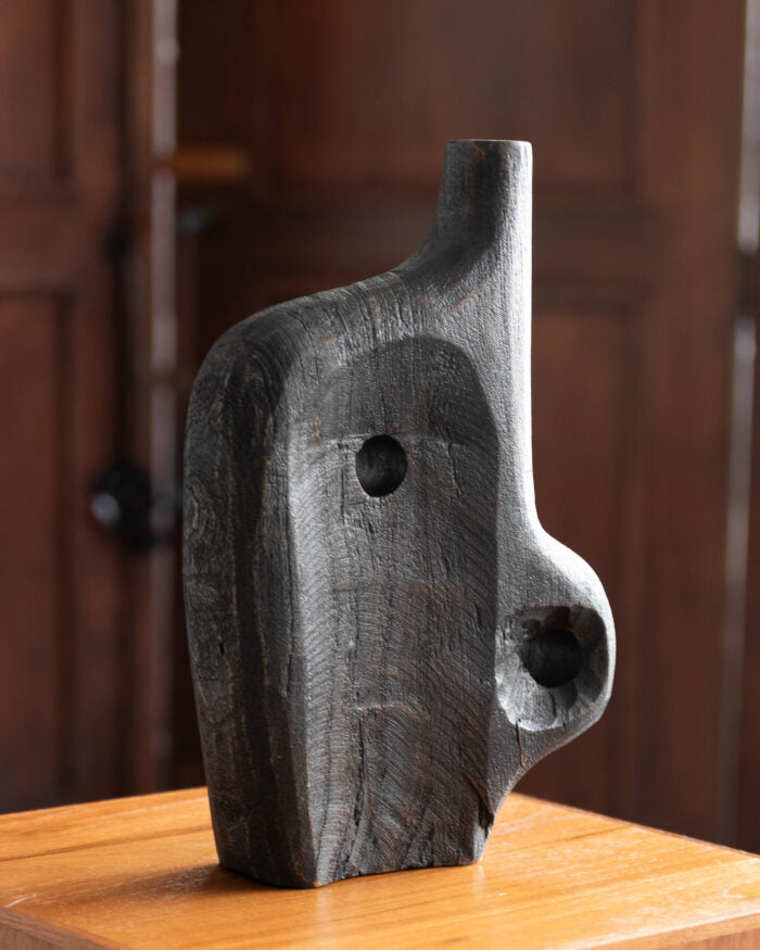 Donker houten vaas. Dit sculpturale architectonische is gemaakt van tropisch, donker hout. In zeer goede staat.