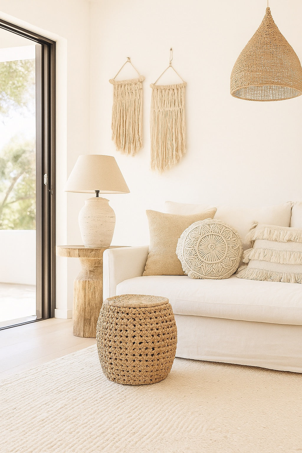 De Zarkah-kruk, handgemaakt van duurzaam bananenblad, is een perfecte mix van rustieke charme en functionaliteit. De natuurlijke textuur en aardse tinten maken het een veelzijdige toevoeging aan elke kamer, of het nu als zitplaats, bijzettafel of decoratief stuk wordt gebruikt. De naam 'Zarkah', geïnspireerd op het Arabisch en betekent 'puur', weerspiegelt het eenvoudige maar verfijnde ontwerp. Hij is stevig en licht en gemakkelijk te verplaatsen, waardoor hij ideaal is voor flexibele woonruimtes of boho-geïnspireerde interieurs.