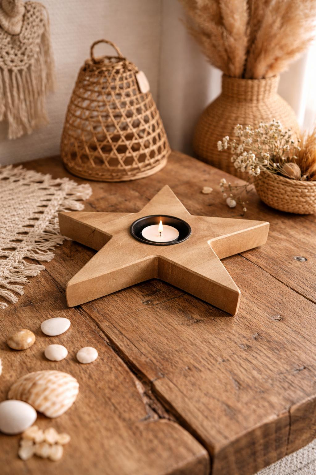 Houten Ster Waxinelichthouder – Natuurlijke Sfeer met een Warme Gloed