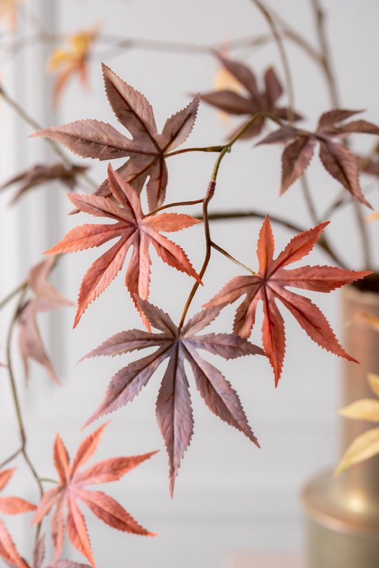 Breng warmte en sfeer in huis met deze prachtige kunsttak in rood-bruine tinten. Met zijn royale lengte van 96 cm is deze zijden bladtak een echte eyecatcher in elk interieur. Perfect om los in een vaas te plaatsen of te combineren met andere kunstbloemen voor een stijlvol en natuurlijk geheel.