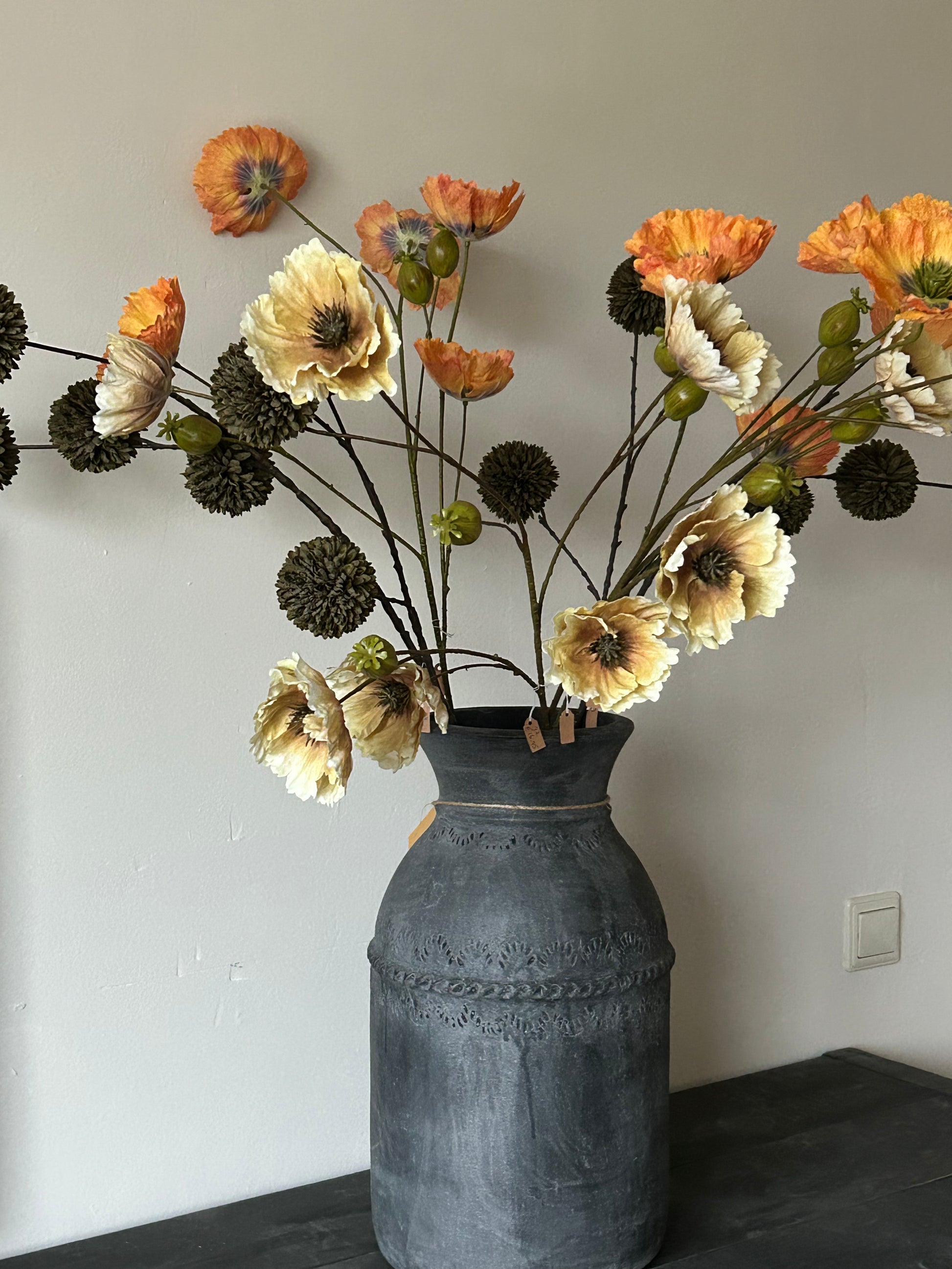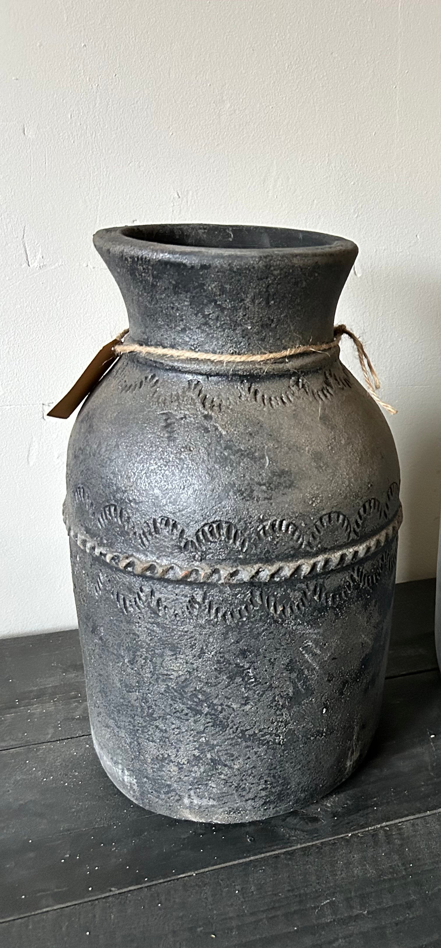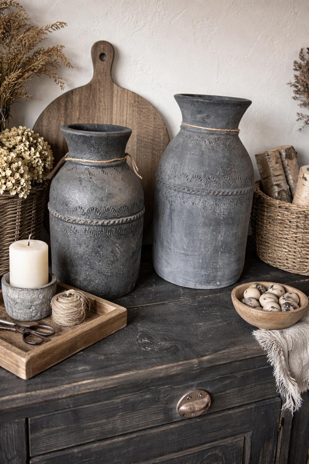 Deze hoge vaas in donkergrijs is een stijlvolle blikvanger met een landelijke, rustieke uitstraling. De sierrand geeft de vaas een ingewikkeld detail, terwijl de robuuste afwerking zorgt voor een stoer en authentiek karakter. Prachtig met lange takken van droogbloemen, maar ook zonder vulling een sfeervol decoratief object dat roest en warmte toevoegt aan je interieur. Het betreft de linkse vaas op de eerst foto.