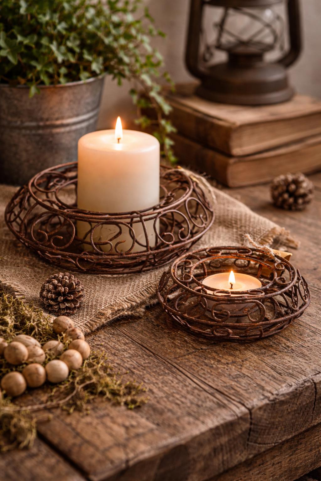 Deze roestkleurige metalen kaarsenhouders brengen warmte en een stoere, landelijke sfeer in huis. De natuurlijke roesttint geeft de set een robuuste en karaktervolle uitstraling en laat zich prachtig combineren met hout, linnen en andere natuurlijke materialen.