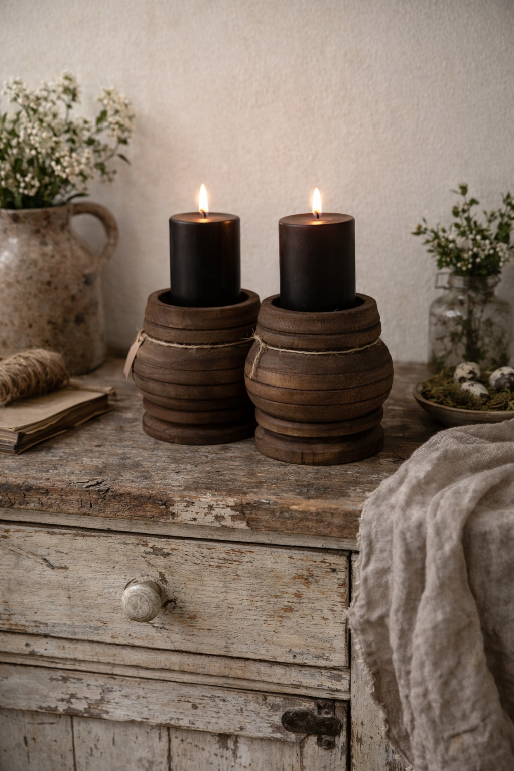 Geef je interieur een warme en authentieke uitstraling met deze set donkerhouten kaarsenhouders. Perfect passend bij een landelijke stijl brengen ze direct sfeer en gezelligheid in huis. Zet ze op een mooie kast, vensterbank of naast je favoriete stoel en geniet van het rustgevende kaarslicht.